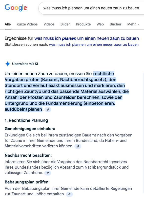 Google KI-Übersicht mit klar formatierten Fragen und Antworten.